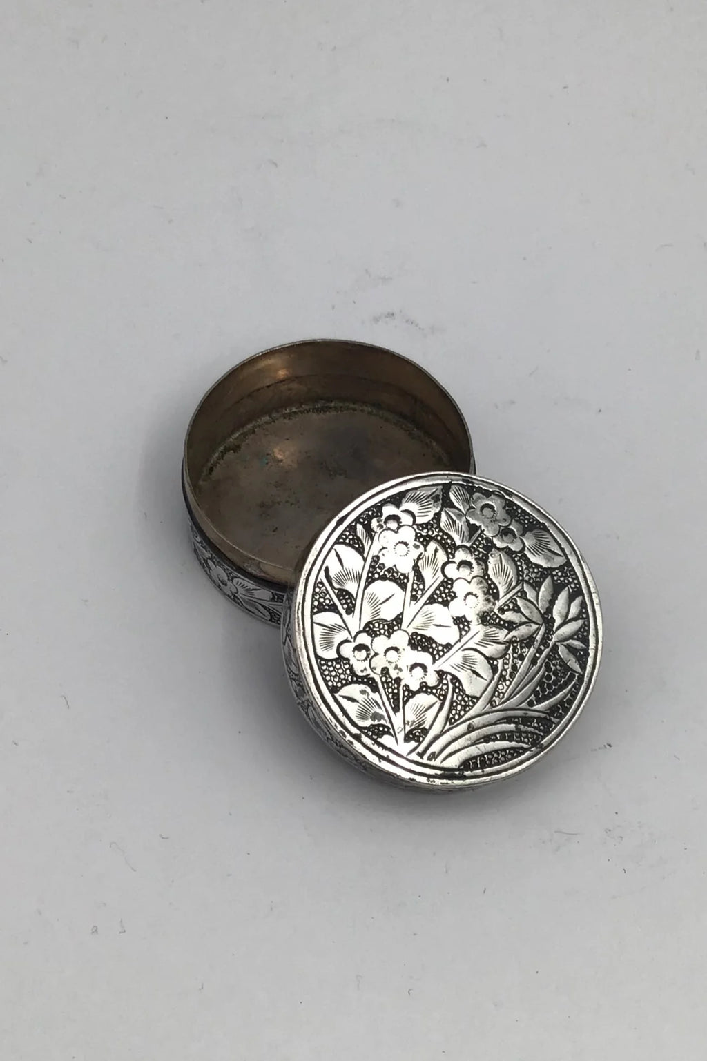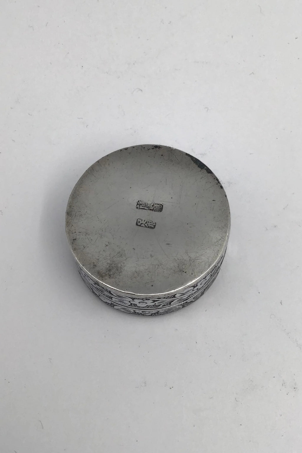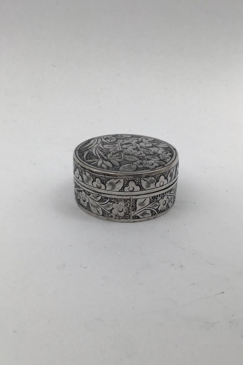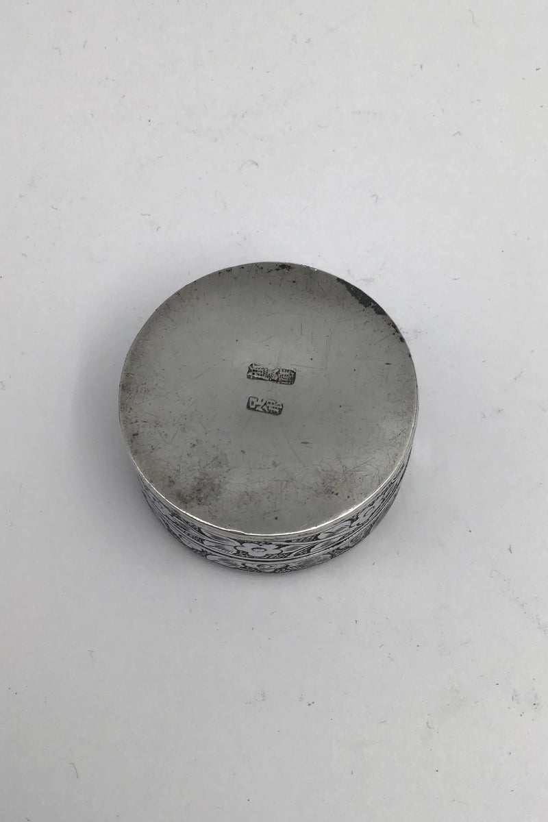 Kinesisk ? Sølv Pilleæske Måler Diam 3.7 cm (1.45 inch) H 1.9 cm (0.74 inch) Vægt 19.77 gr (0.70 oz)