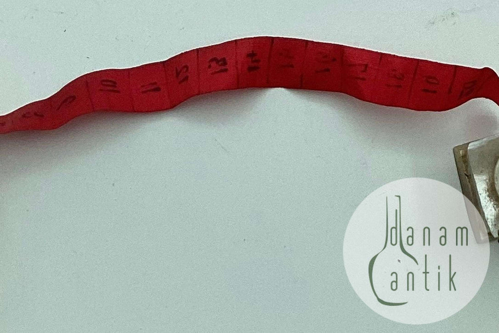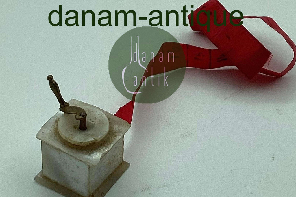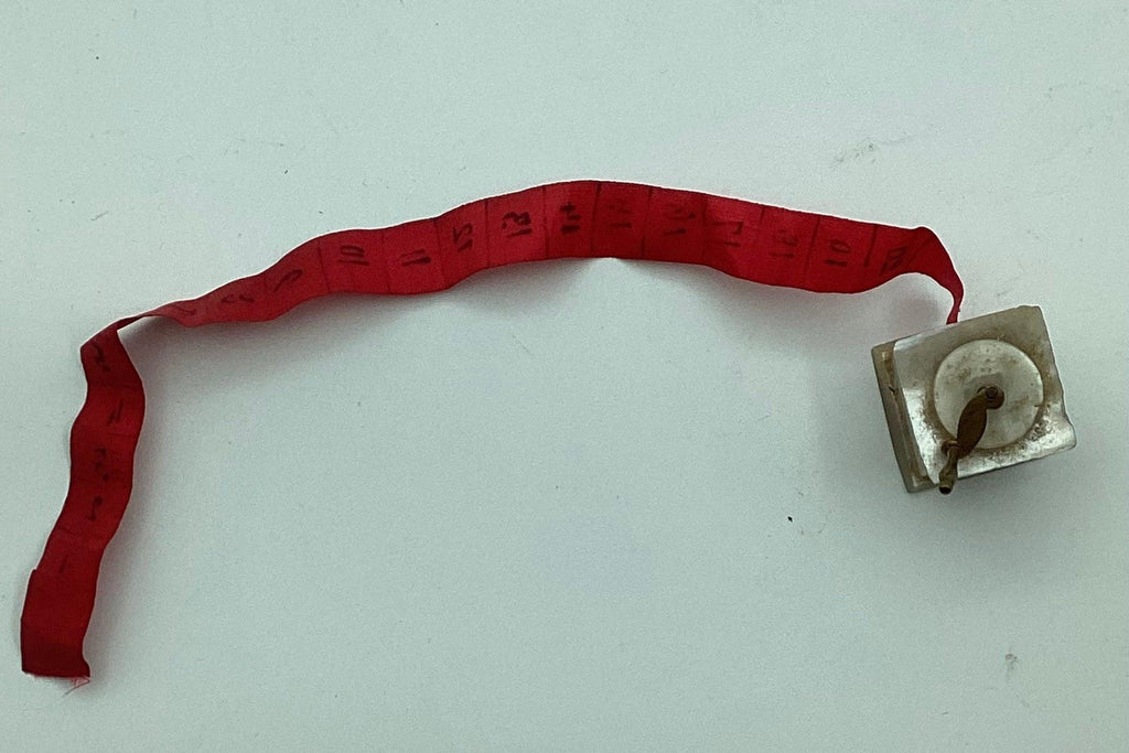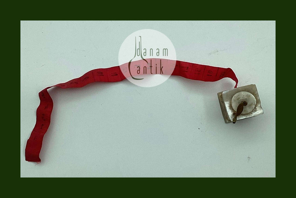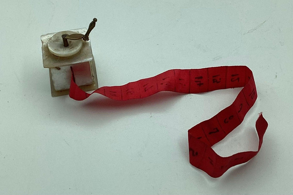 Målbånd med kasse af perlemor c. 1880. Fungerer ikke. Målebåndet kan ikke rulles ind. Kassen måler 2 x 2 cm (0.78 x 0.78 inch)