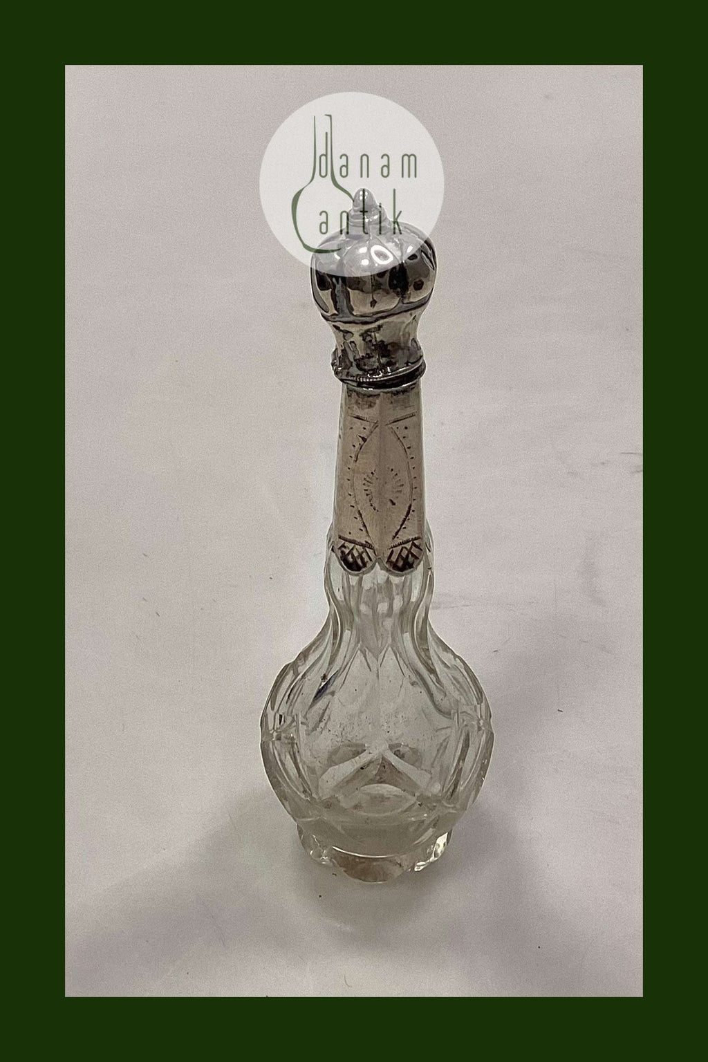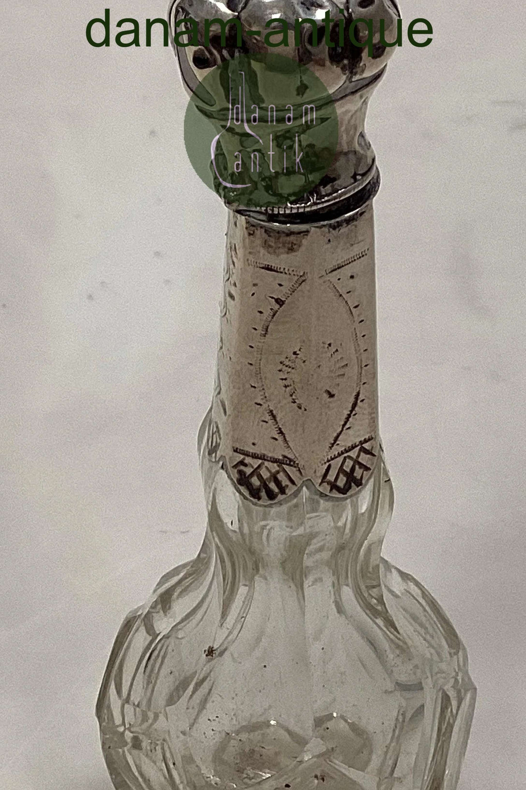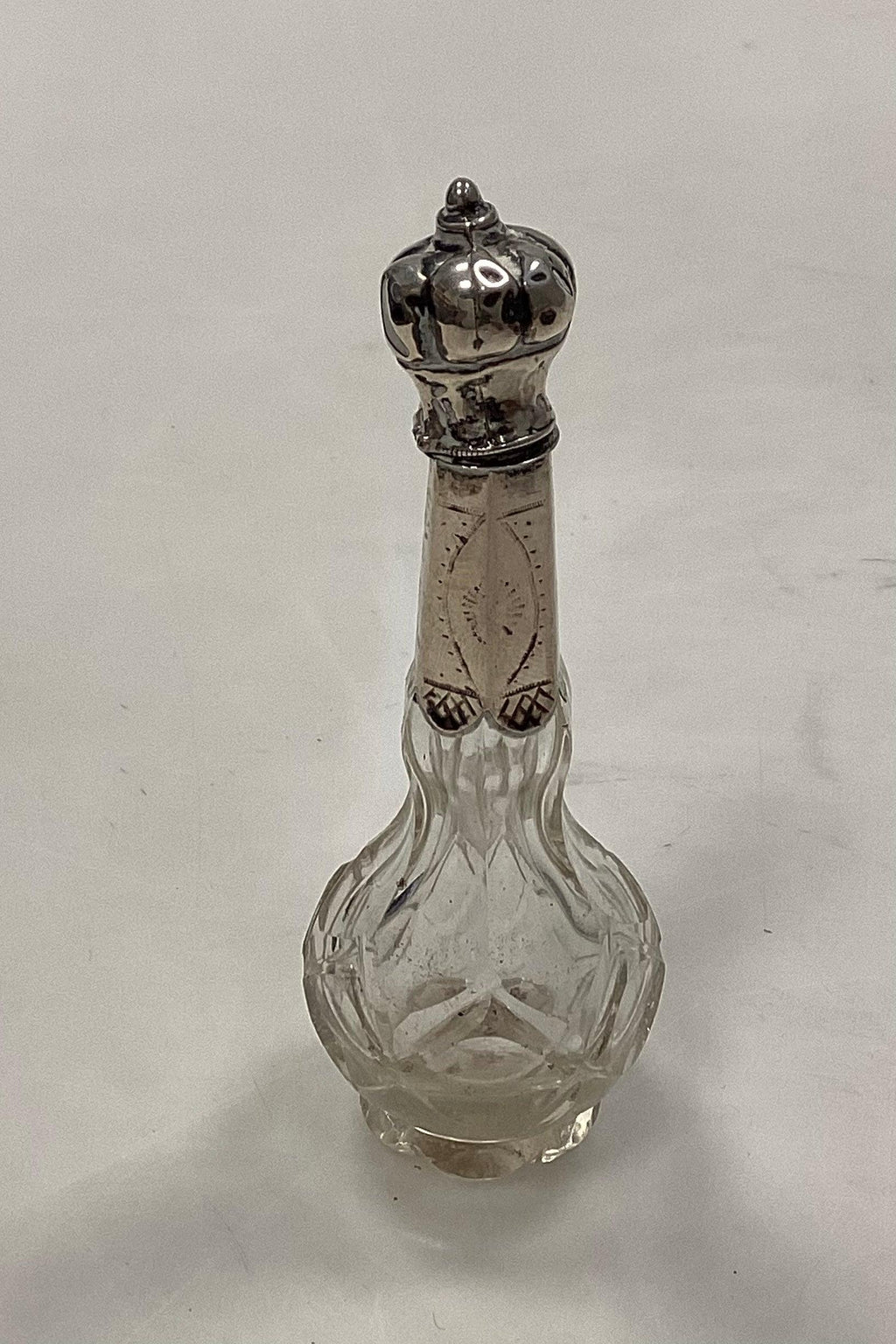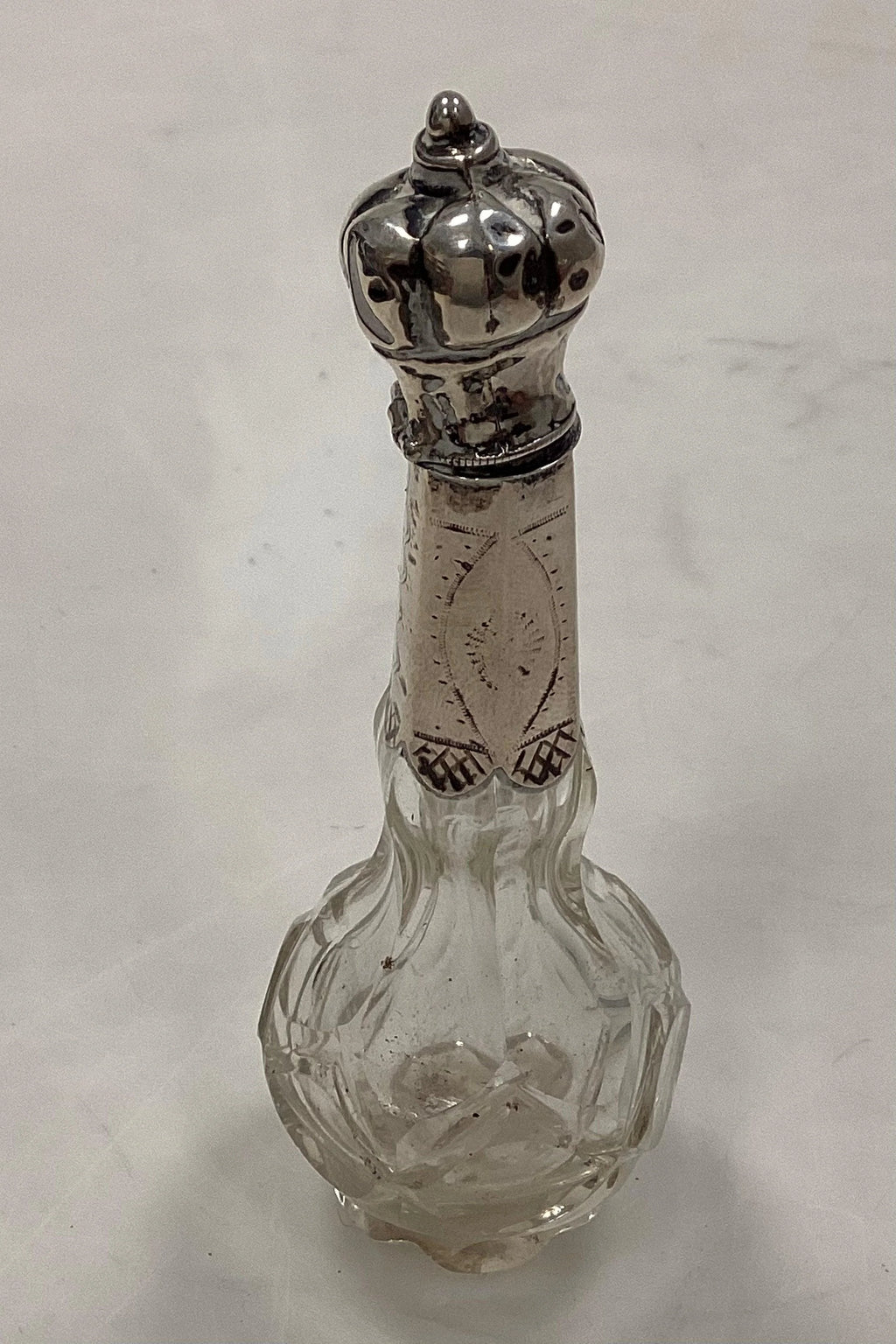 Parfumeflacon i glas med sølvmontering 19. århundrede. I god stand. Sølvmontering lidt skæv, som billederne viser ! H. 12 cm (4.72 inch)