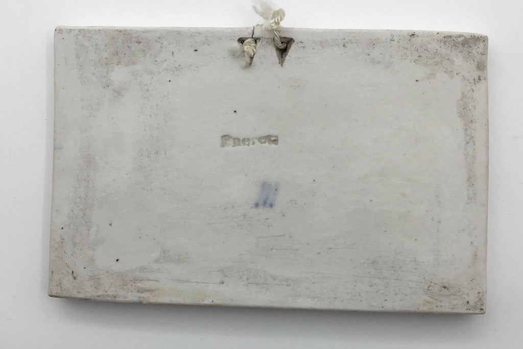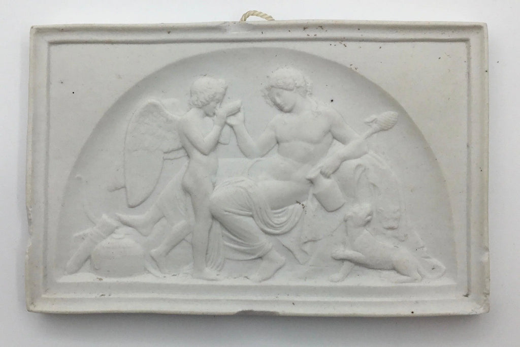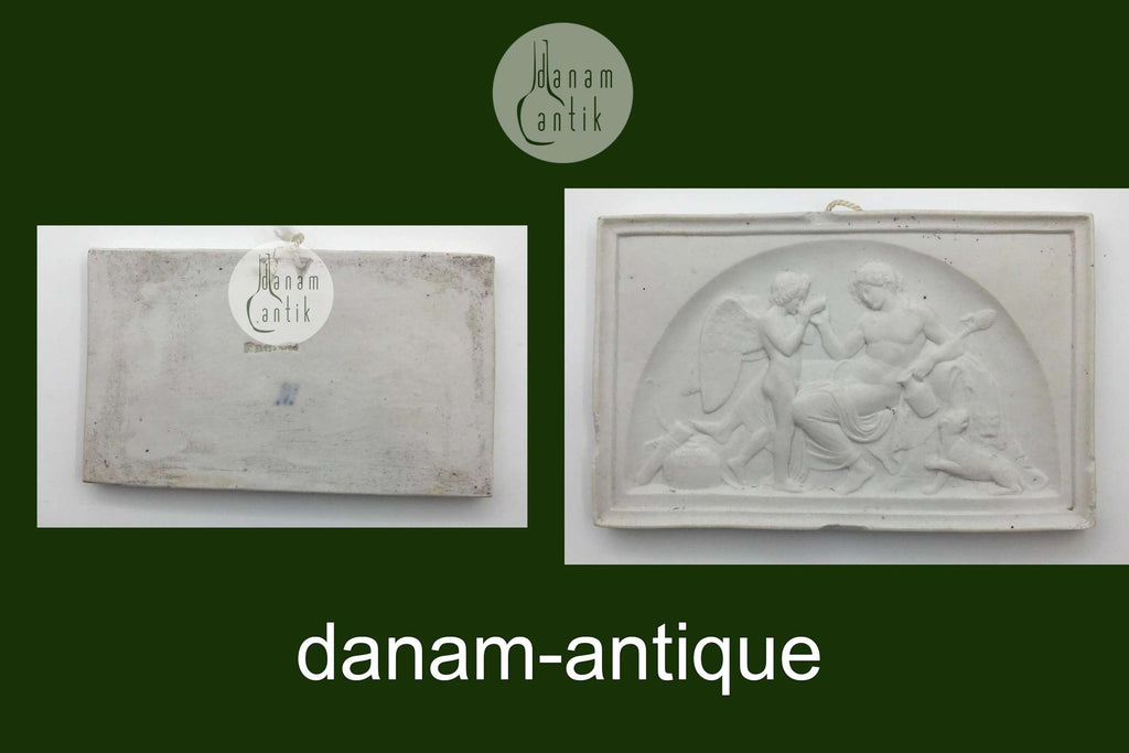 Royal Copenhagen Biscuit Platte Amor hos Bacchus No 66. Kopi fra 1847 af Th. Mule efter Thorvaldsens original fra Rom efter 1910. Måler 14cm x 9cm. Flere som det kan ses af billedet. Fire skår på alle fire sider !