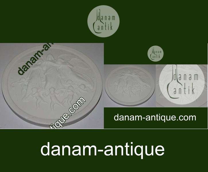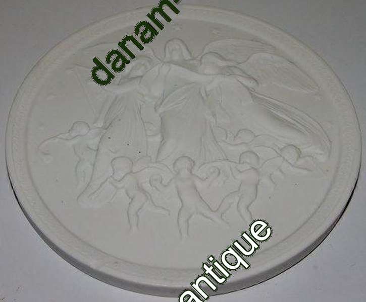 Royal Copenhagen Biscuit Platte Juleglæde i Himlen No 111. Kopi fra 1843 af Chr. Christensen efter Thorvaldsens original fra Nysø 1842. Måler 15,3cm. Har afslag kl.12.00 og kl.7. Ellers i god stand.