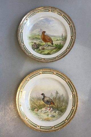 Royal Copenhagen Flora Danica/Fauna Danica Jagtstel Frokost tallerkner No 240/3550 (Sæt på 12) Måler Diam 22 Latinske navne: Putorius furo, Tarandus rangifer, Tetrao urogallus, Machetes pugnax, Tringa alpina, Phasianus colchicus, Lagopus albus, Caccabis rubra, Tetrao urogallus, Anas boschas, Limosa melanura og Haematopus ostrealegus. Maler H Larsen
