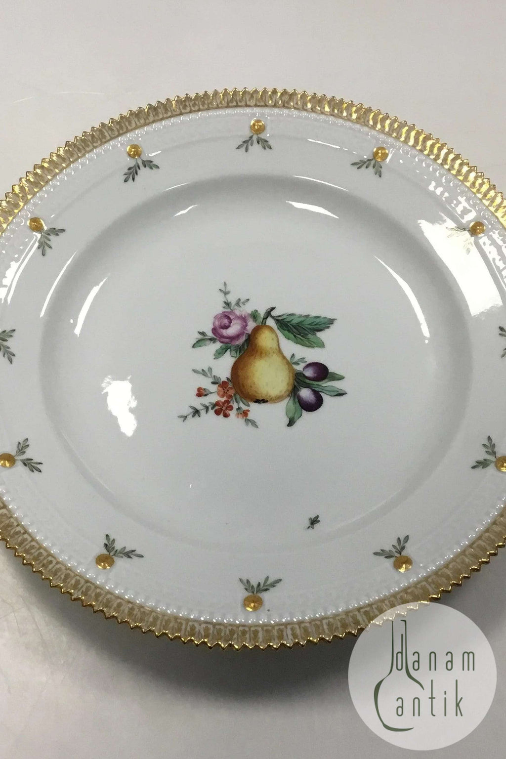 Middagstallerken No 17/3549. Dekoreret med frugter i overglasur og guldkant. Måler 25cm (9 27/32 in.)