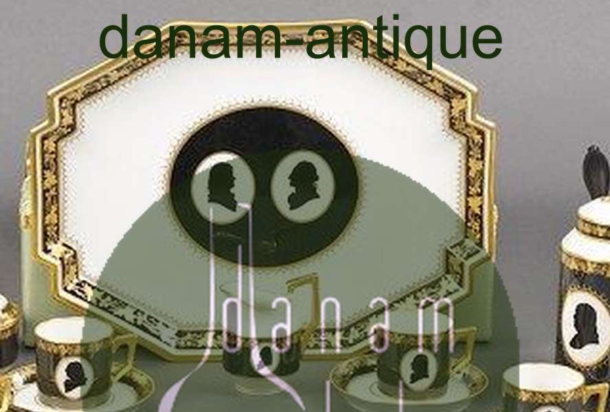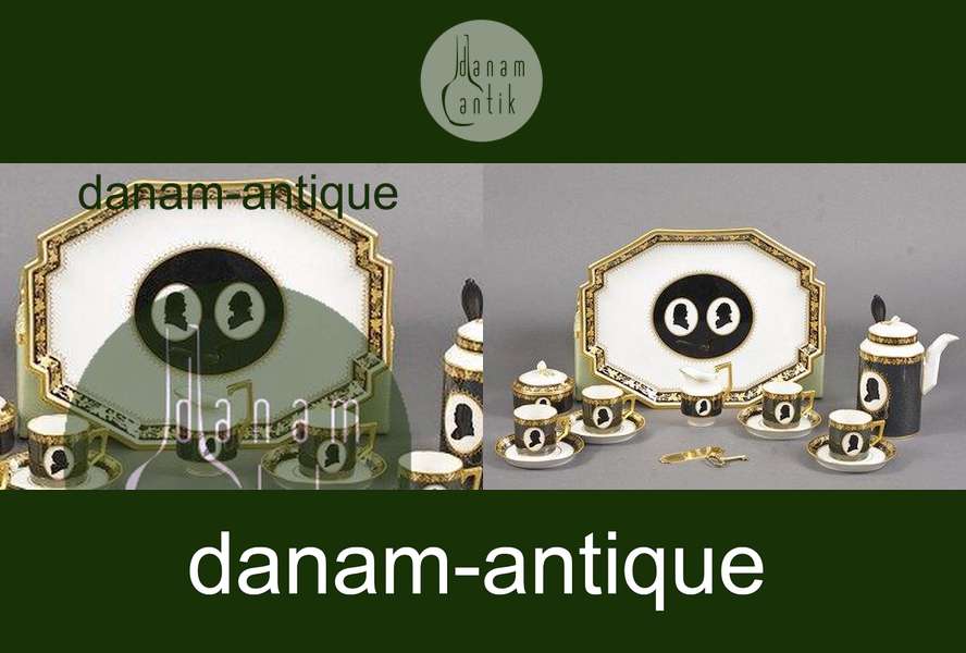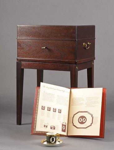 Royal Copenhagen Kgl. P. - The Colonial Coffee Service fremstillet i anledning USA 200 års uafhængigheds Jubilæum d. 4 juli 1976. Bestående af håndlavet mahognikiste med løst understel. Indvendig foret med lysegrøn silke og agramaner. Indhold én stjert kaffekande og tilhørende fire par kopper med underkopper, samt bakke, sukkerskål og flødekande. Alt bemalet i antracitgrå og belagt med 24 kt guld. Motiverne er silhouetter af USA's ni ledende skikkelser omkring "Declaration of Independence" i 1775. Sættet er produceret i 300 eksemplarer. Der medfølger læder indbundet certifikat fra Royal Copenhagen.Det første sæt blev givet til den amerikanske præsident. Nøgle samt messingplakette til navn medfølger. Skrin med stand h. 66. b. 42. d. 32 cm. Porcelæn ialt 12 dele.
