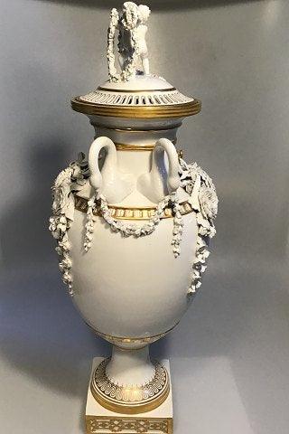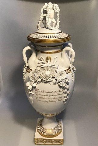 Royal Copenhagen Prydvase med svaner (1870-1890) 60 cm Indskription på forsiden(dedikation indvendigt i låget)