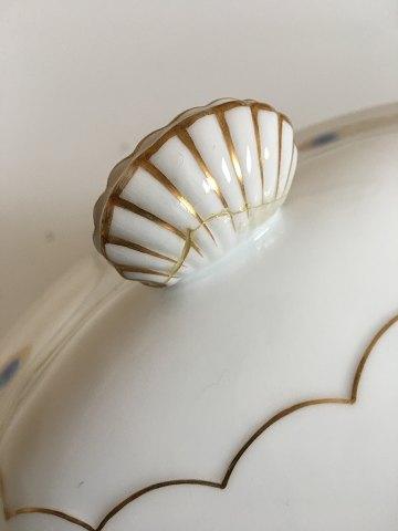 Royal Copenhagen Stel No 118 Suppeterrin med Låg på Underfad. Påfugl med Guldkant. Selve terrinet måler 26 x 20 cm. I god stand uden det store slid på guldet, men låget har en reparation (se billede). Antikt, Sjældent Spisestel fra Royal Copenhagen