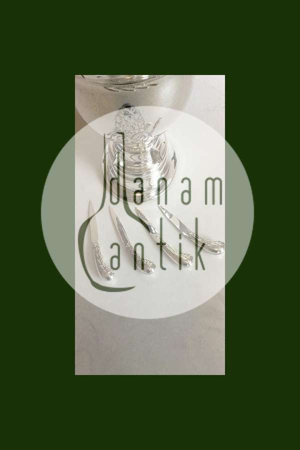 Sølvplet Frugtskål med 4 knive og glasindsats