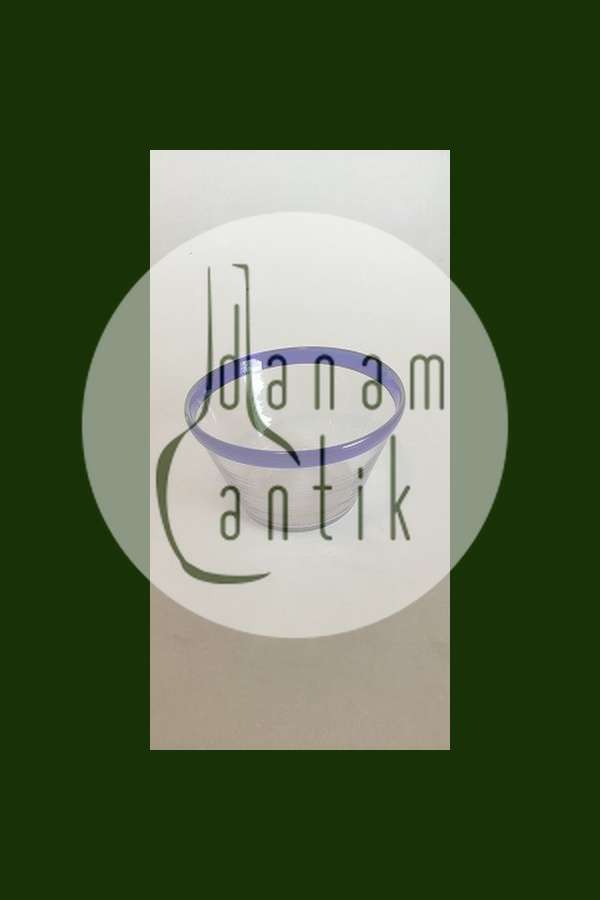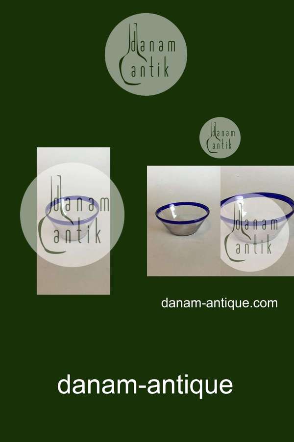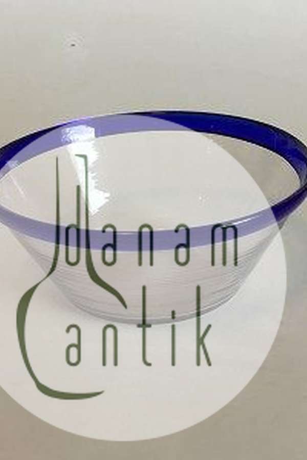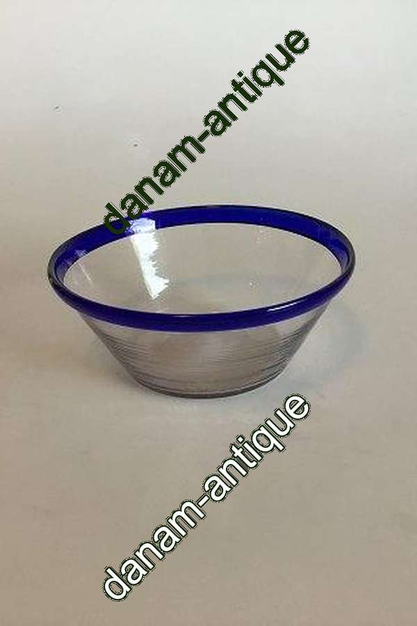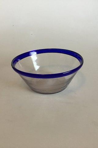 Ymerskål i glas med blå kant. Måler 15 cm x 6 cm
