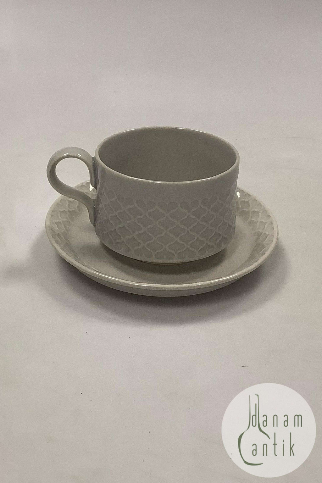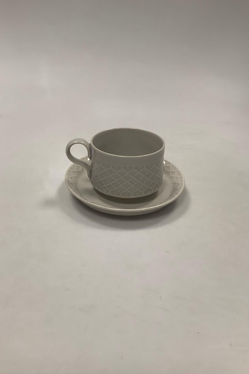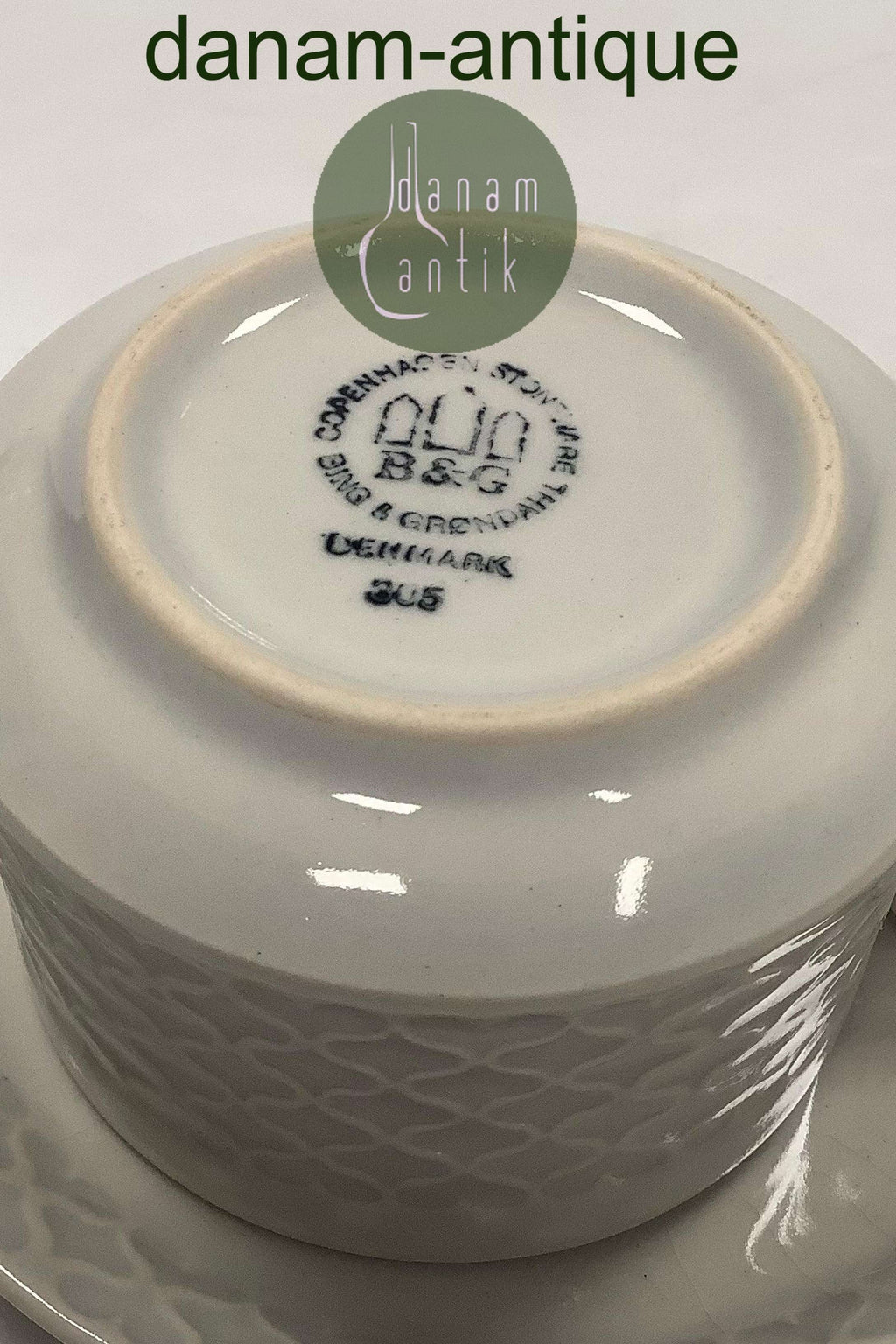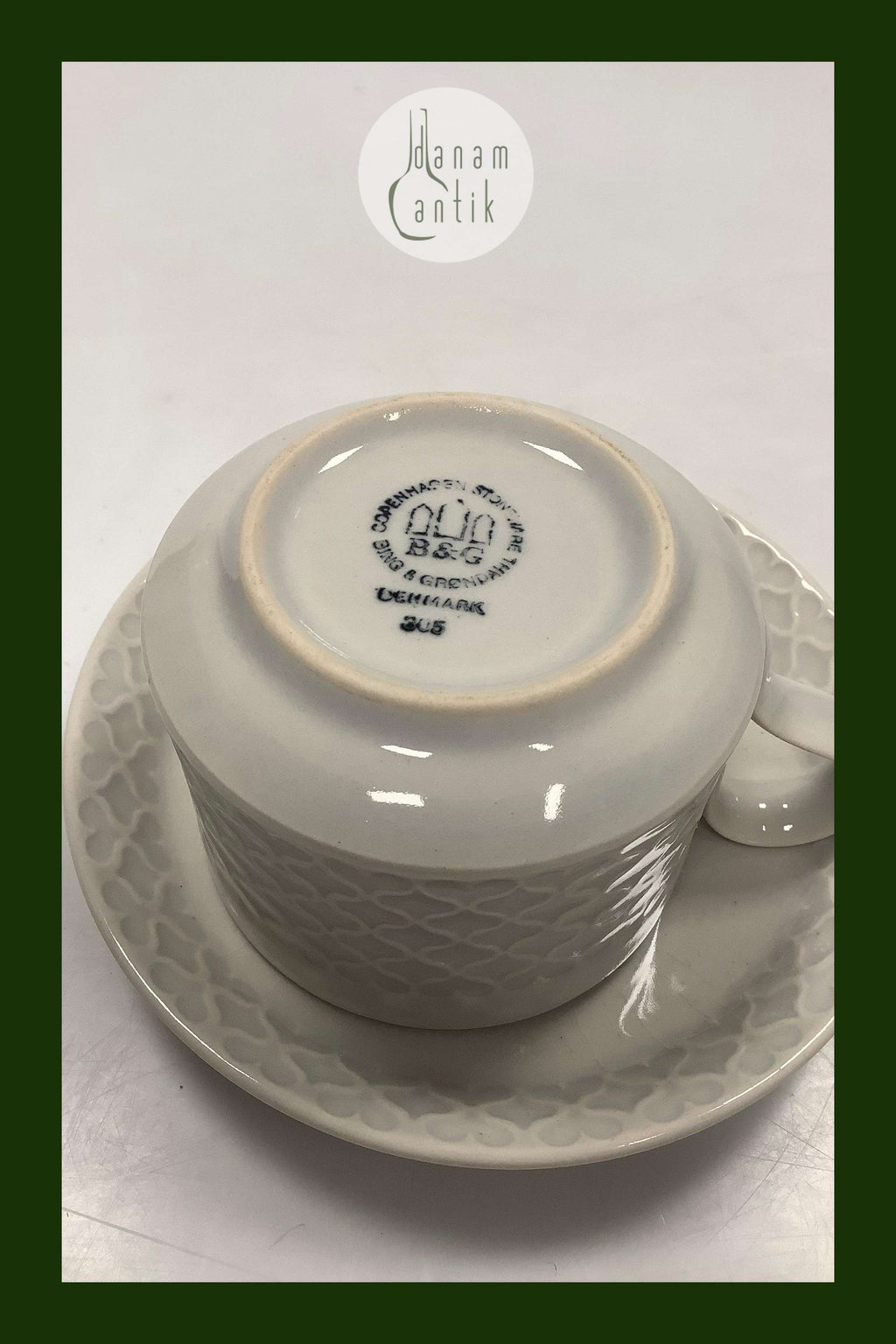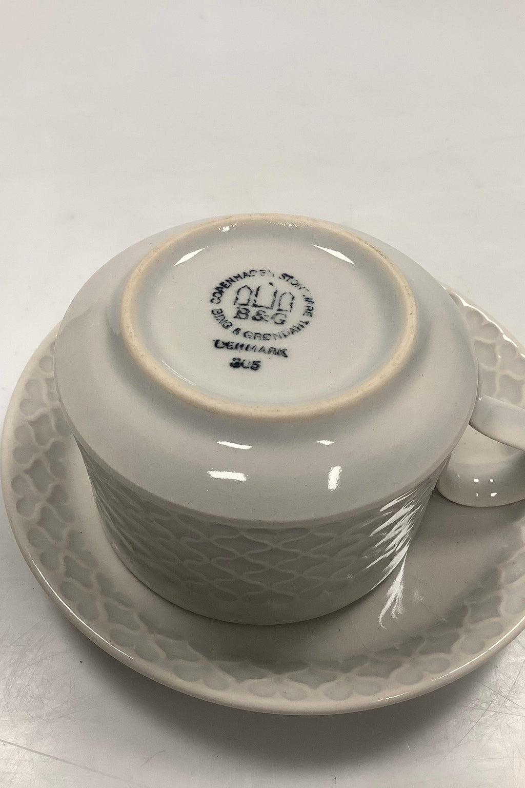 Bing和Grondahl/Kronjyden石器白色堇菜咖啡杯和碟子,编号305。杯子的尺寸为6 x 8厘米(2 23/64 x 3 5/32英寸)。 ,釉面有轻微的裂纹。