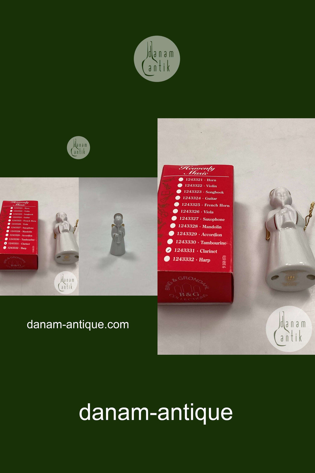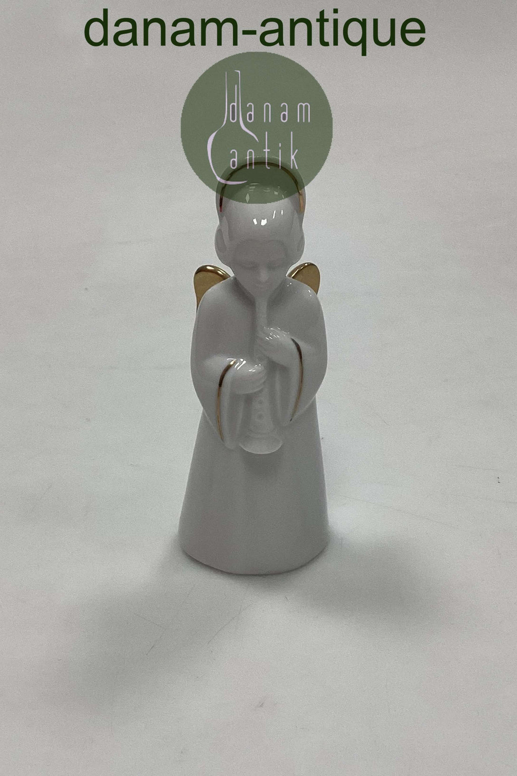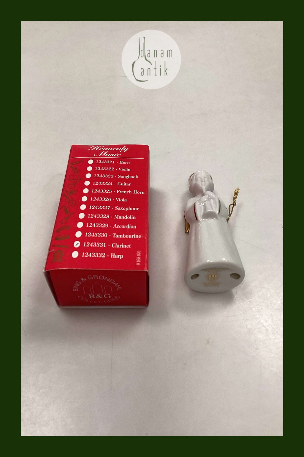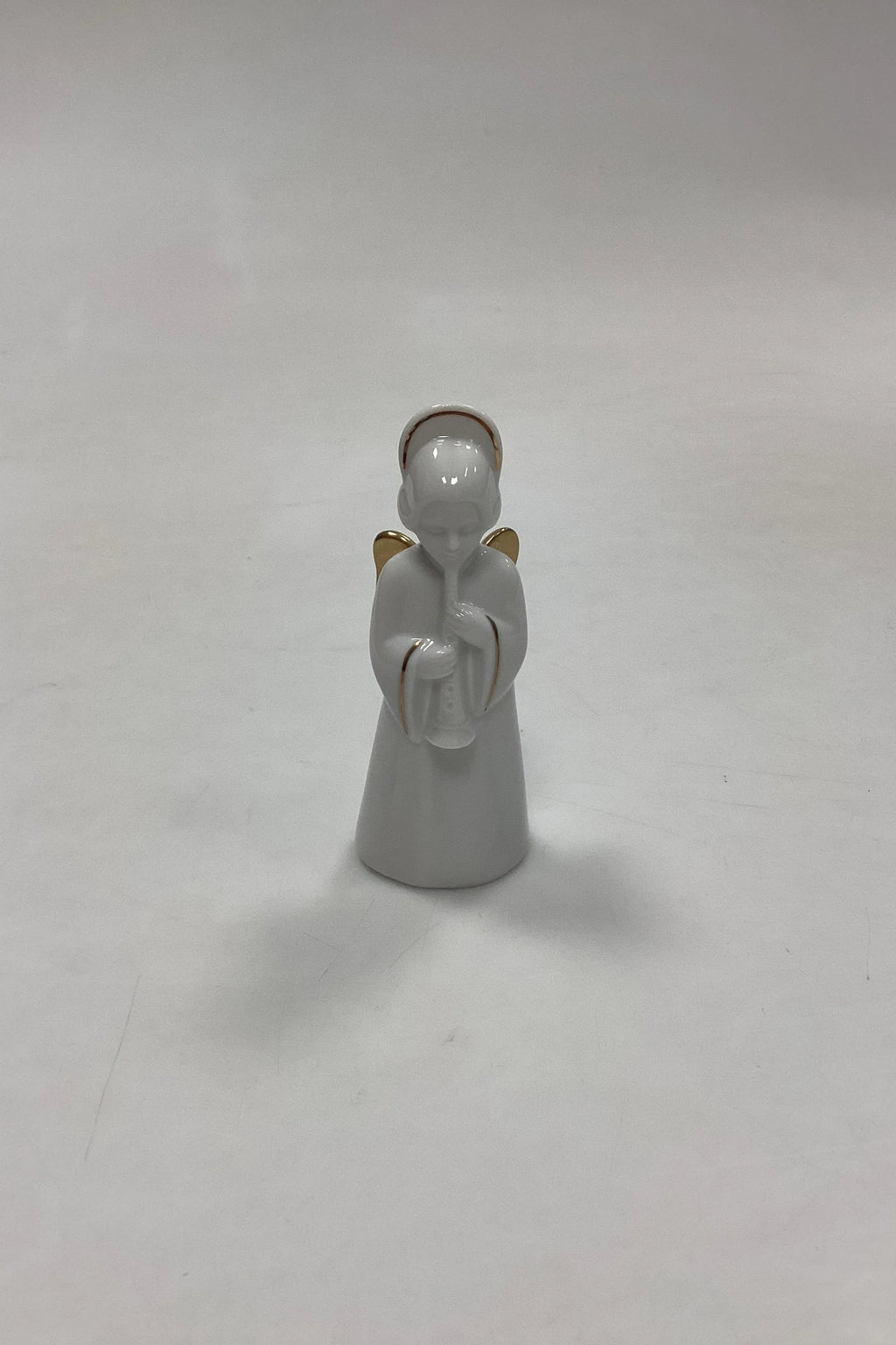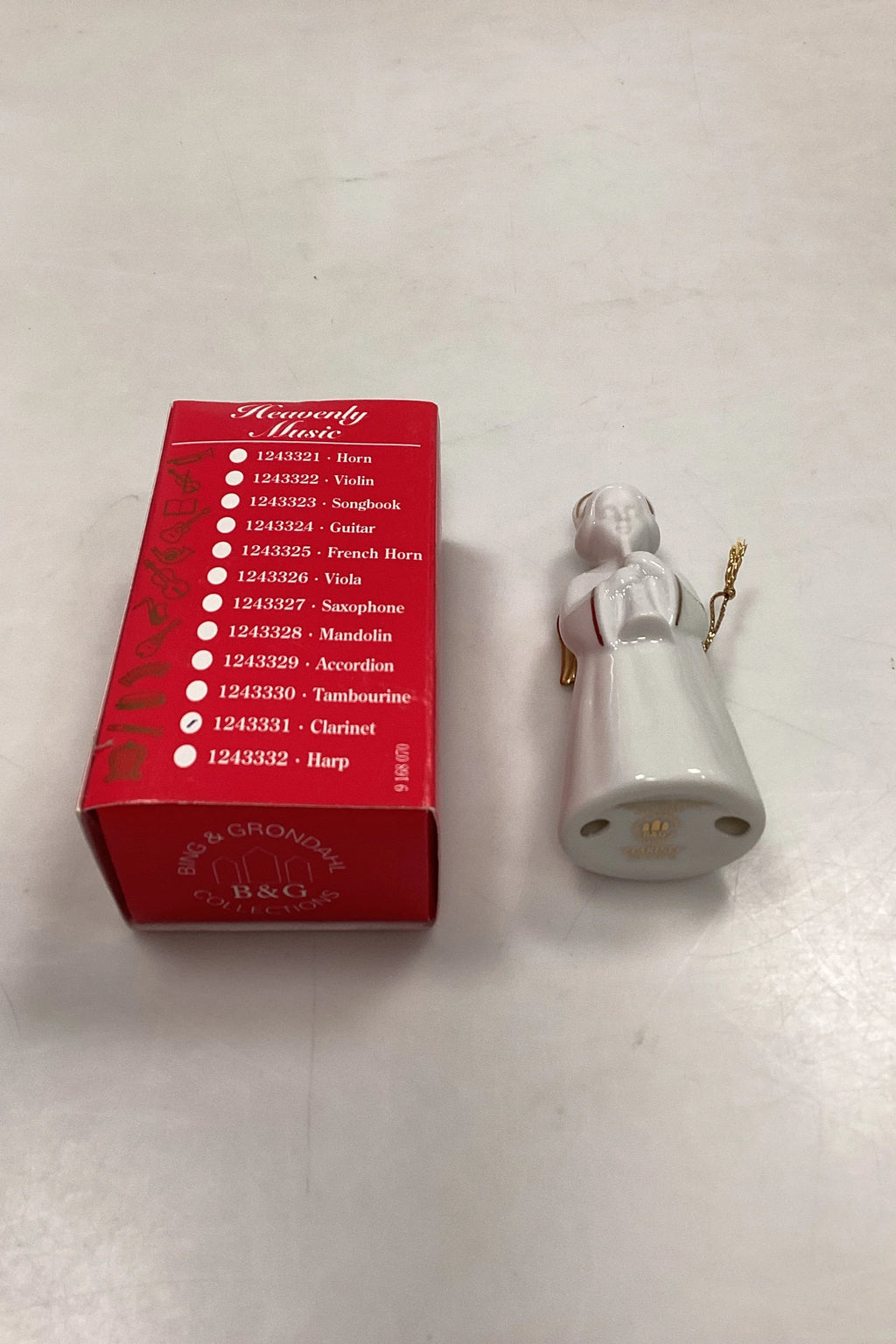 Bing og Grøndahl Figur Heavenly Music Engel - Klarinet No. 11. Juleornament i blanc de chine porcelæn med guld og snor til ophæng. Måler 9,5 cm / 3,74 in.