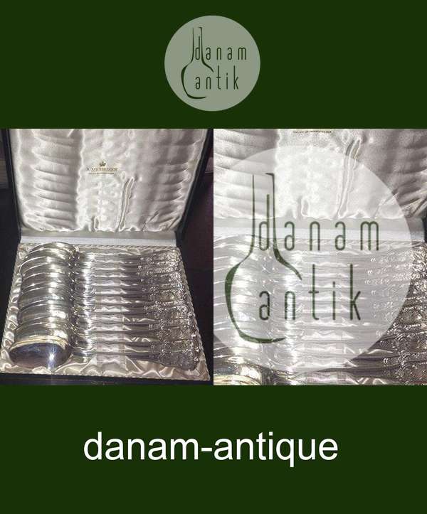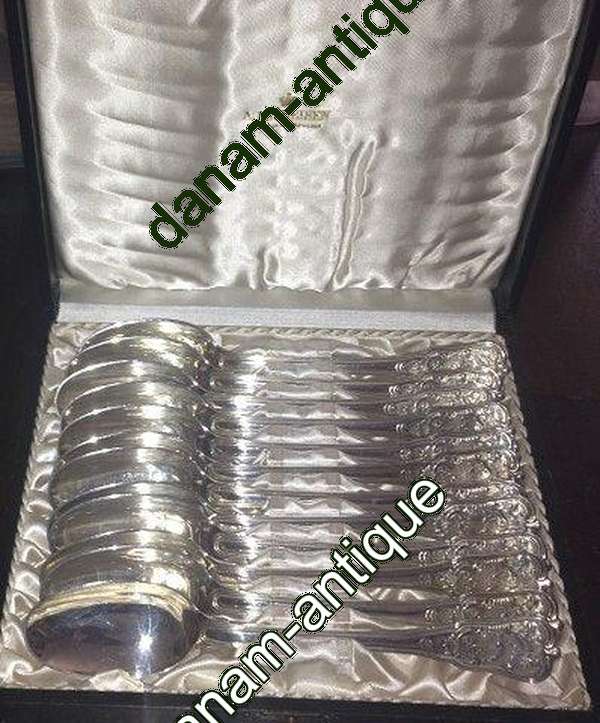 12个Anton Michelsen Rosenborg纯银甜点勺子,由Ole Hagen设计。状况良好,装在原来的盒子里。尺寸为18.5厘米
