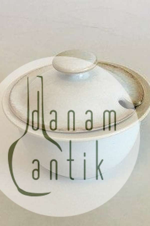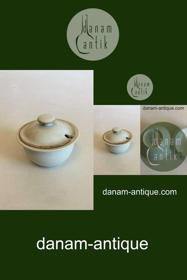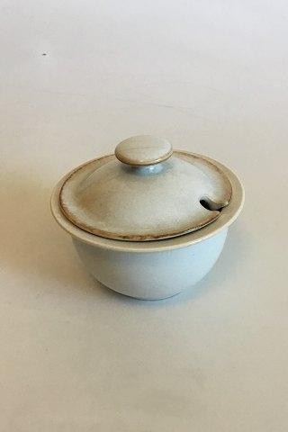 Bing & Grondahl 釉面石器 "Coppelia "糖碗/橘子酱罐,带盖,编号302。尺寸为6.5厘米×11.5厘米直径。