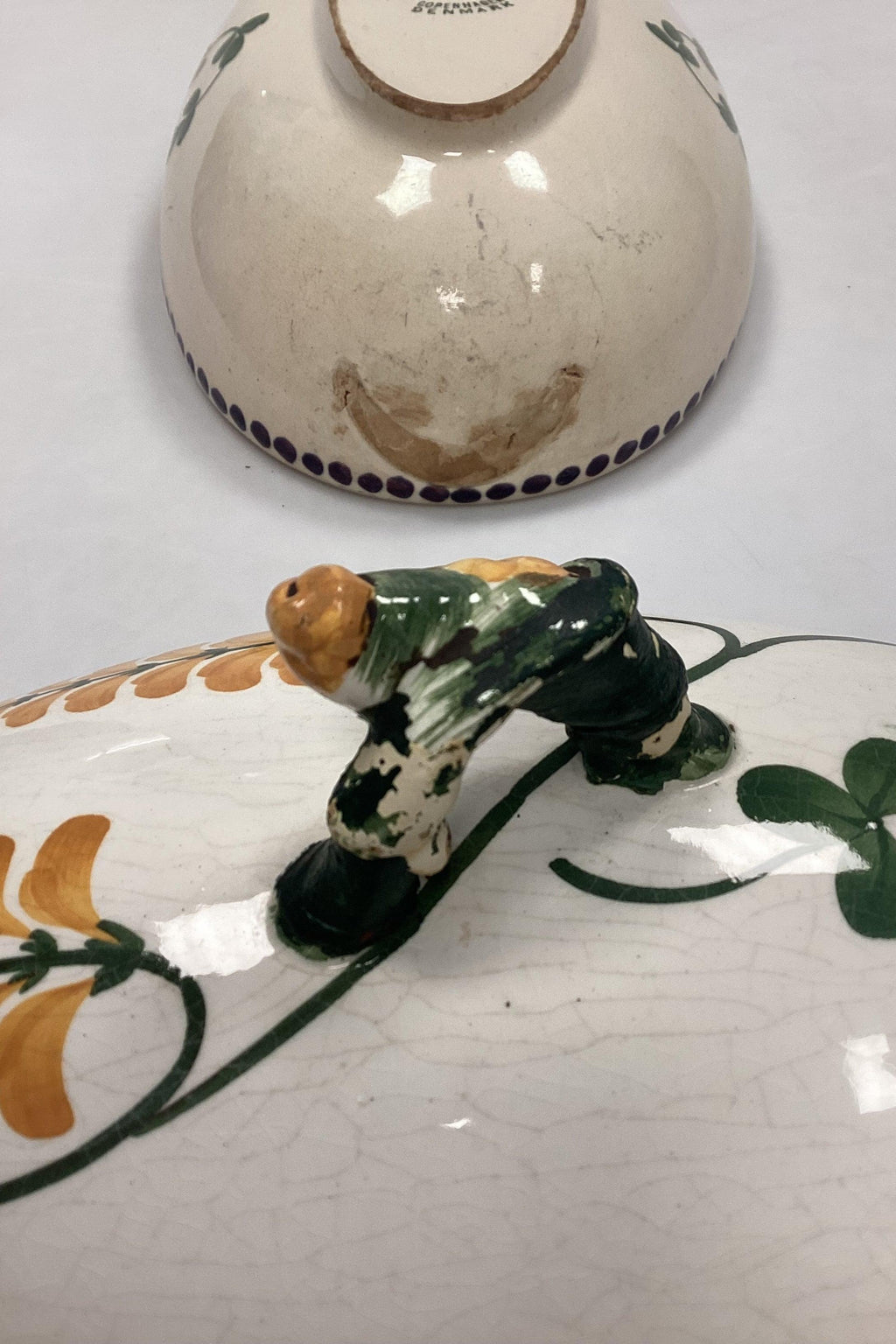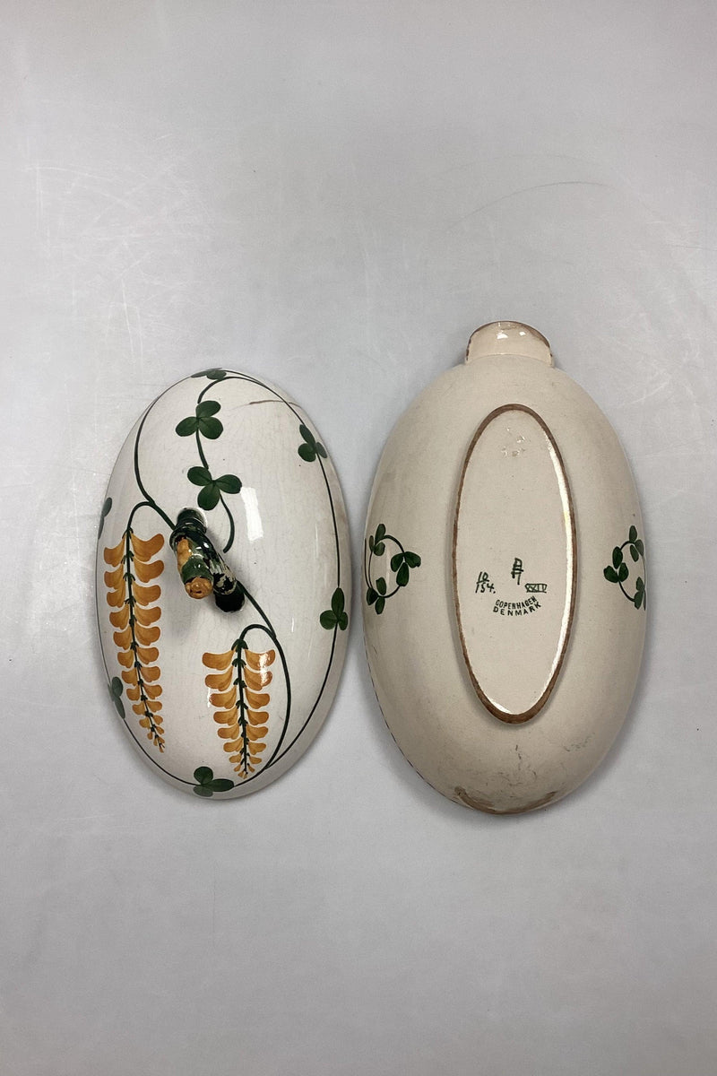 Aluminia Guldregn (Laburnum) Oval Skål med låg No. 10/154. Mangler hank på underdelen. Hårrevne, flere afslag og reparation på lågets hank.