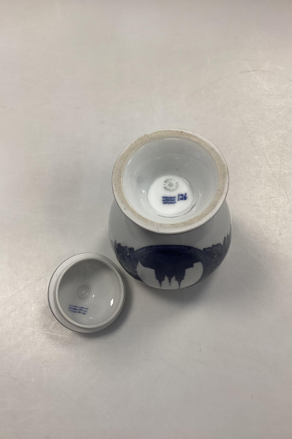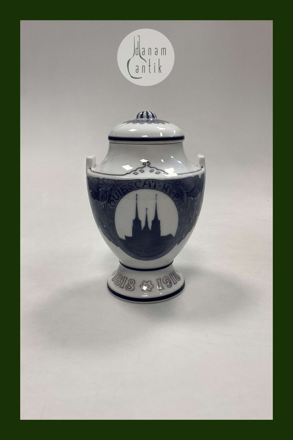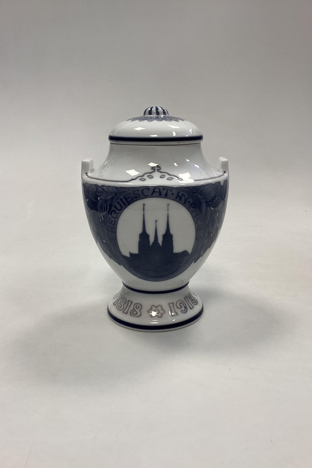 Royal Copenhagen Vase med låg 8.April 1818-1918. I anledning af 100-året for Christian d. IX´s fødsel. Måler 17,5 cm / 6,88 in. 2. Sortering med glasurfejl over kongens hoved.