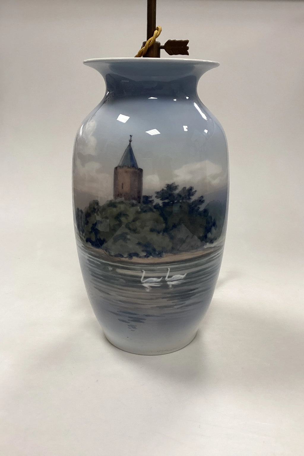 Royal Copenhagen Art Nouveau Vase / Bordlampe No. 2757/2983. Motiv af Gåsetårnet i Vordingborg.Måler 32 cm / 12,59 in. og 61 cm / 24 in. med fatning. Ledning og fatning er i dårlig stand,