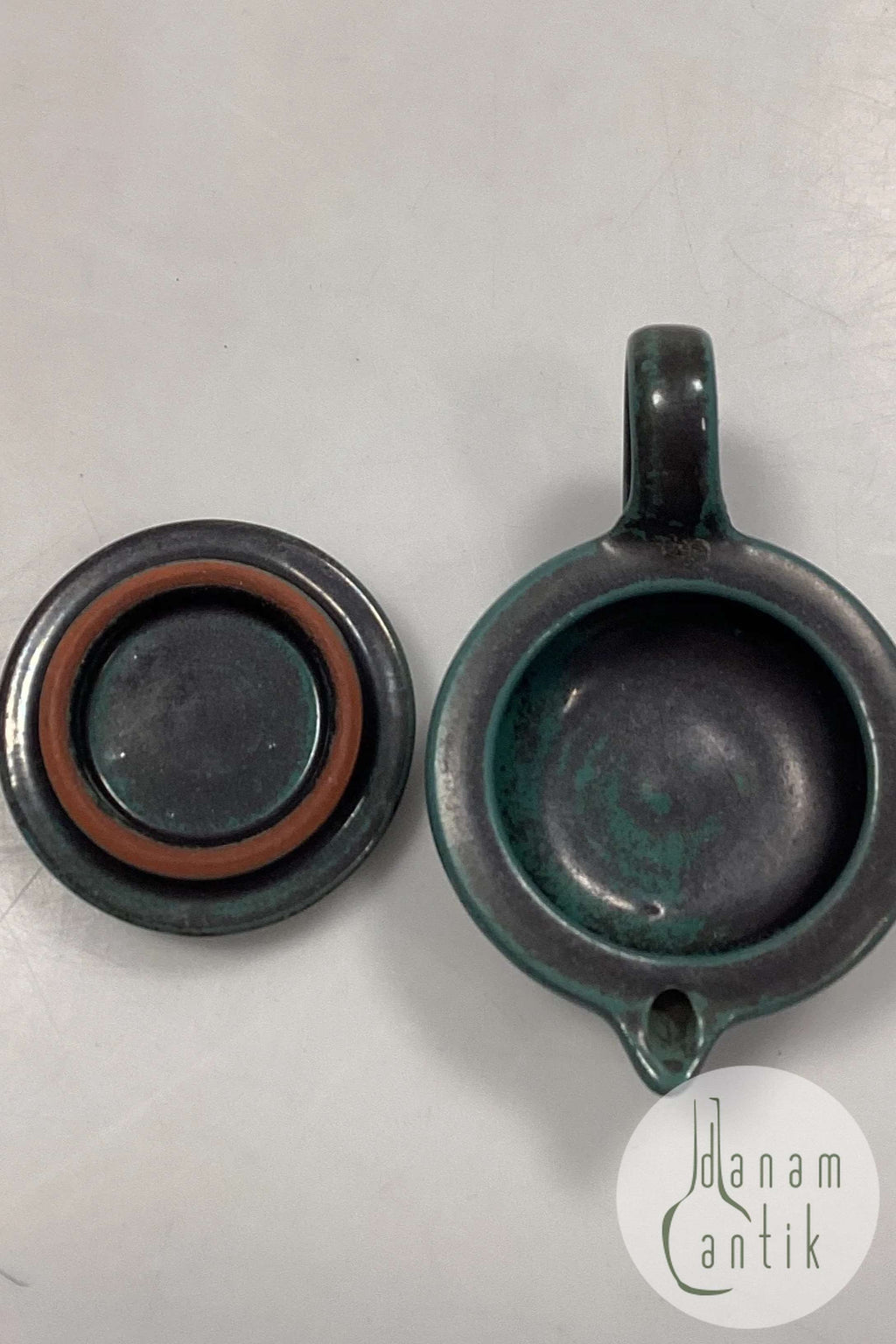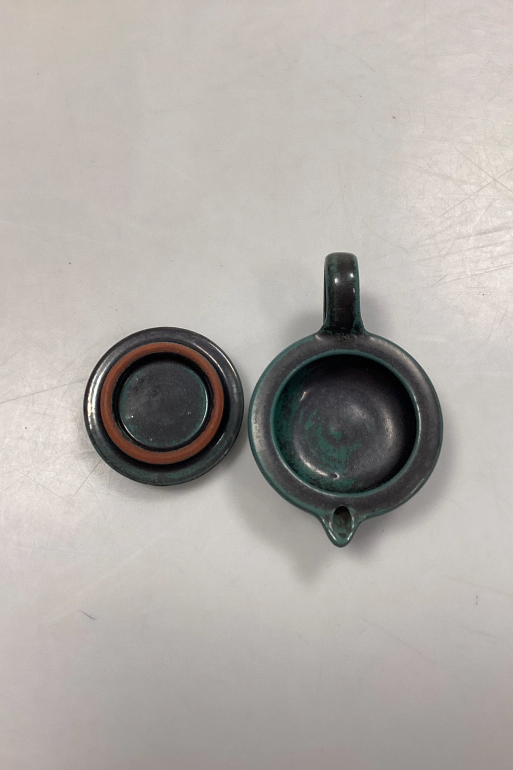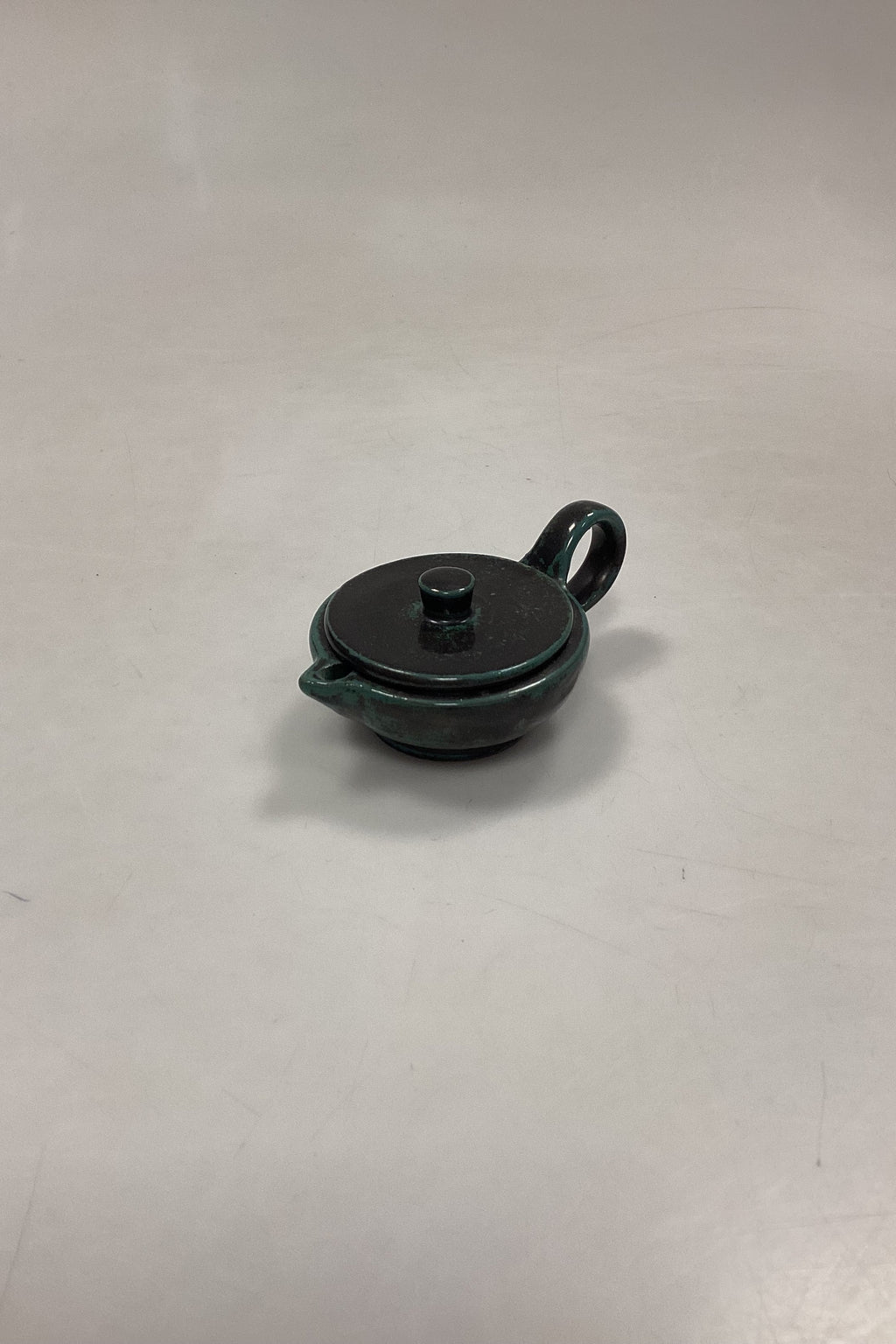 Lille olielampe i grøn/sort keramik. Designet af Vibeke Utke Ramsing. Måler 10,5 cm x 4,5 cm / 4,13 in. x 1,77 in. Mikro afslag på låget.