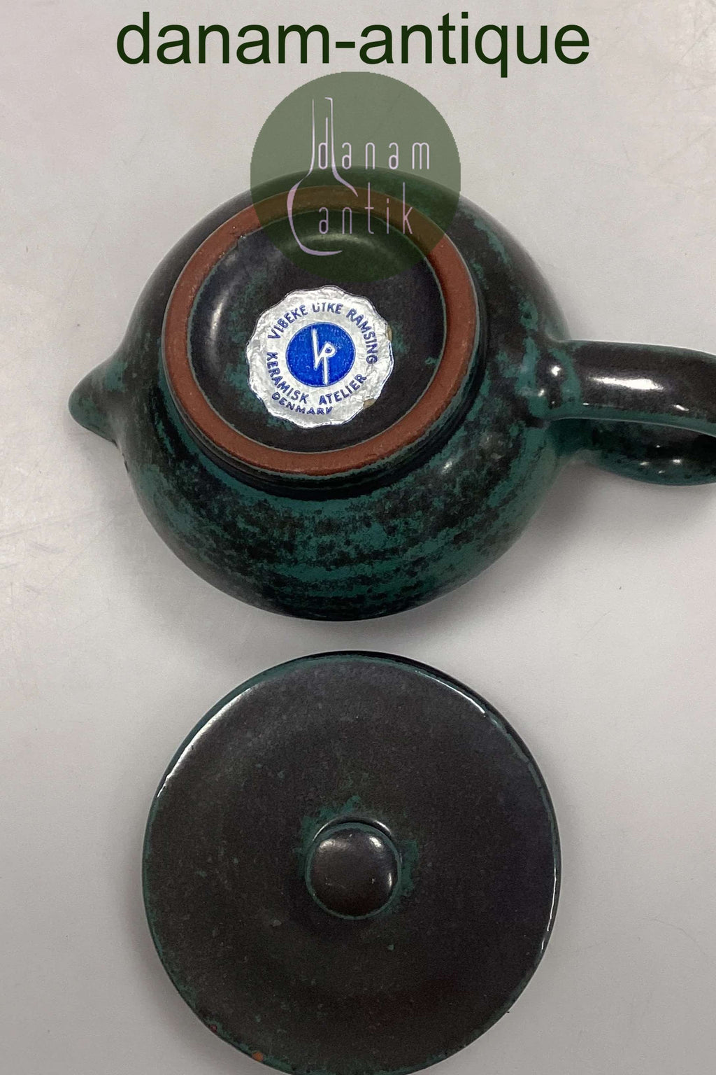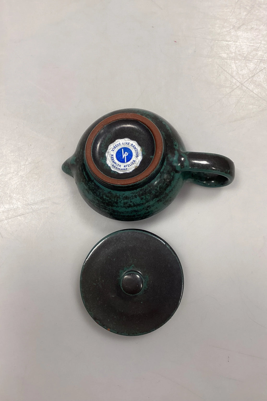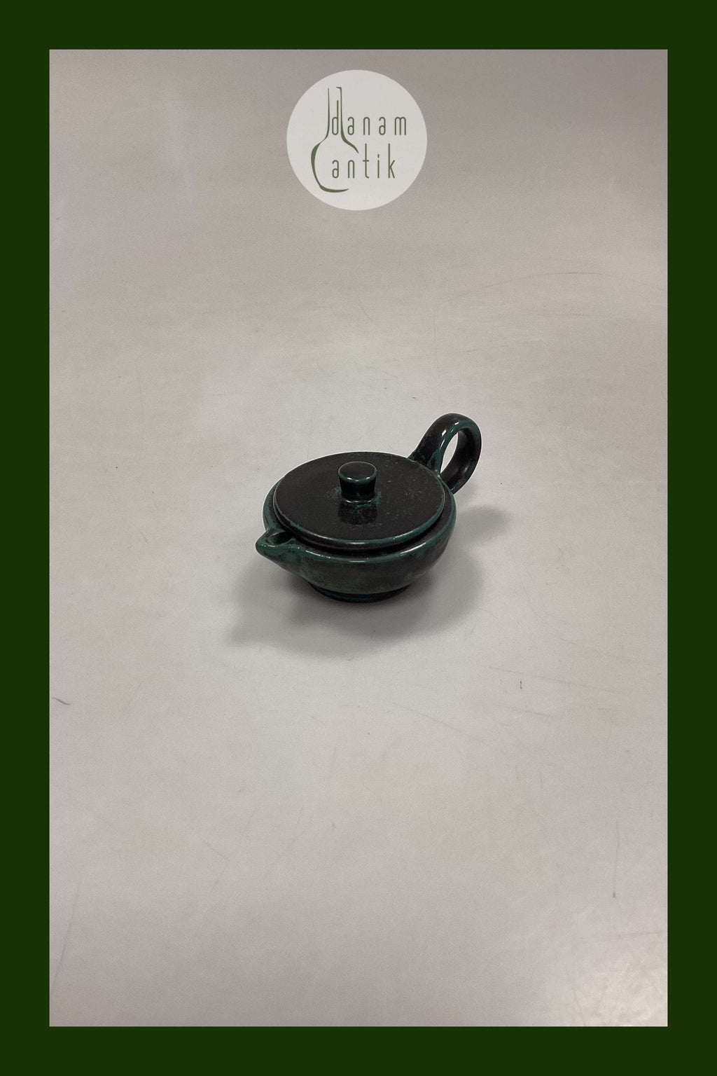 Lille olielampe i grøn/sort keramik. Designet af Vibeke Utke Ramsing. Måler 10,5 cm x 4,5 cm / 4,13 in. x 1,77 in. Mikro afslag på låget.
