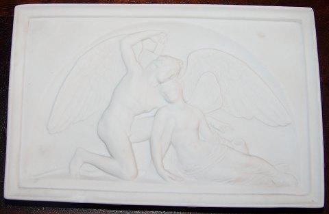 皇家瓷器素瓷盘子丘比特唤醒了绝望的心灵,78号。复制Th. 1847年的骡子,是根据1810年蒙特内罗的托尔瓦德森的原作设计的。尺寸为15 x 9厘米。Royal Copenhagen。左下方有一个缺口。